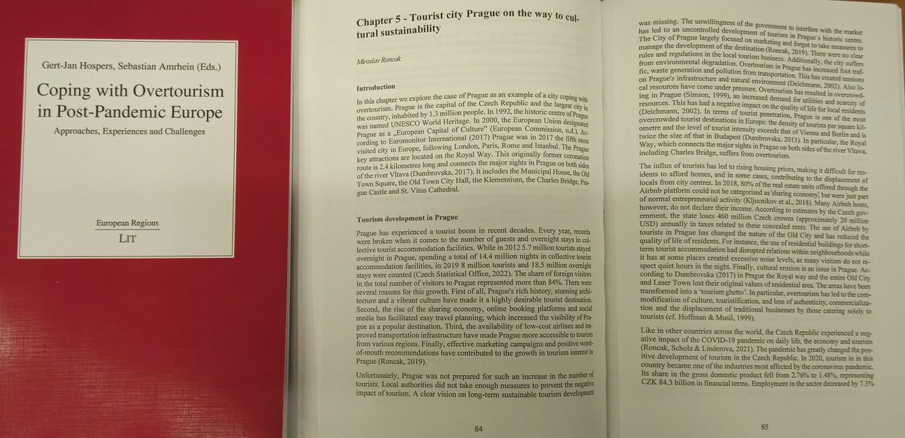 Ve srovnání s prvotní monografií „Overtourism: Issues, Realities and Solutions“ od Rachel Dodds a Richarda Butlera, která vyšla před čtyřmi lety, kniha nejen mapuje problematiku nevyváženého cestovního ruchu v rámci pandemie COVID-19, kdy docházelo ke krátkodobému přesunu overtourismu do přírodních a horských destinací, ale doporučuje i možná řešení eliminace negativních dopadů turismu po pandemii a prezentuje řadu příkladů z celé Evropy směřující k udržitelnějšímu rozvoji turistických destinací. Předností knihy jsou mezinárodní experti na danou problematiku, jako autoři kapitol. Mezi ně patří, např. Ko Koens a Roos Geeritsma, kteří analyzují situaci v Amsterdamu, Florian Weber, jenž prezentuje výsledky dopadů cestovního ruchu na různé typy destinací či Andreas Kagermeier analyzující vztah rezidentů a návštěvníků. Kapitola o Praze, pod názvem „Tourist City Prague on the Way to cultural sustainability“, jejímž autorem je Mgr. Miroslav Rončák, se zabývá některými pozitivními kroky, které Praha po schválení „Koncepce příjezdového cestovního ruchu hlavního města Prahy“ implementovala, zároveň ale upozorňuje na řadu výzev, před kterými Praha při své cestě k udržitelnějšímu cestovnímu ruchu a uspokojení potřeb všech aktérů cestovního ruchu, stále stojí.