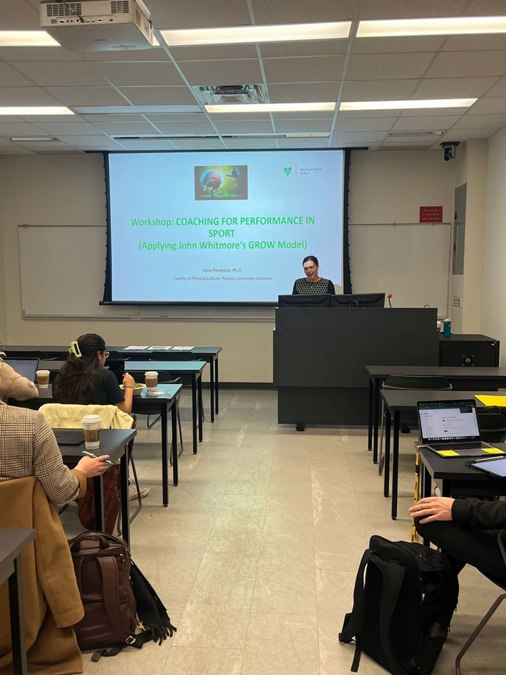 At the Faculty of Kinesiology, Sport, and Recreation, Dr. Hana Pernicová delivered a total of four thematically focused workshops and lectures. The first workshop, titled "Coaching Principles Applied to Sports Training", was held for a group of twenty participants, including Master’s students from the Coaching in Sport program, coaches, and other faculty staff. Dr. Pernicová greatly appreciated the participants’ active engagement and their interest in the topic. More than 30 participants took part in her second workshop, Psychological Skills in Individual Sports, where they actively shared their own experiences with mental preparation in sport. As part of the Sport Psychology course, Pernicová also delivered two lectures on Burnout and one on Coaching Psychology to an audience of over 200 undergraduate students. These sessions were conducted in collaboration with Dr. Amber Mosewich, who took part in the 23rd edition of the International Teaching Week hosted by FTK in spring 2024.